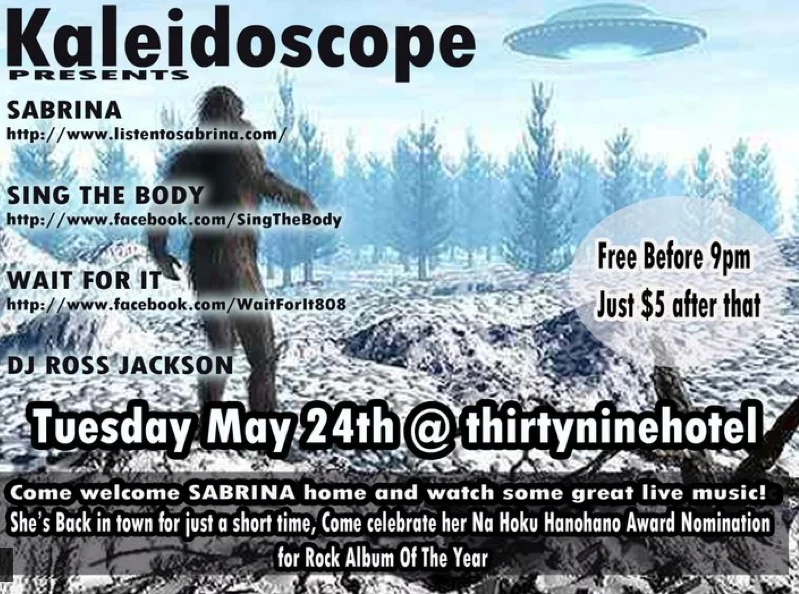 Kaleidoscope at 39Hotel - May 24 It’s been a few months since being back in the Hawaii sunshine…so I am heading home for a couple of weeks to soak up the sun and play a couple of shows. I can’t wait! Here is show #1. Special thanks to Brandon Apeles for setting this up so quick. MontclaireMay 4, 2011sabrina, hawaii, gigs Facebook0 Twitter LinkedIn0 Reddit Tumblr 0 Likes
